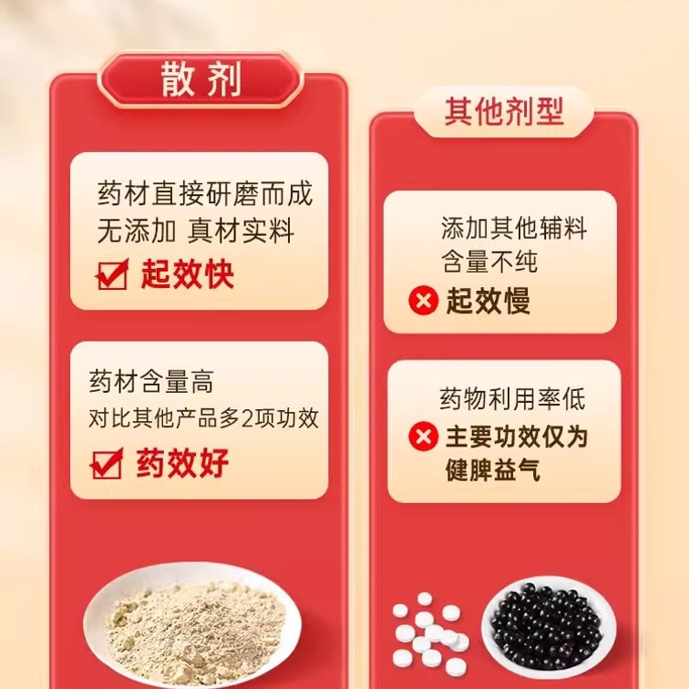 | Ingredients | Ginseng, Poria Cocos, Rhizoma Atractylodis Macrocephalae, Glycyrrhiza Uralensis, Chinese yam, Platycodonopsis, Lentinus edodes, Semen Coix lacryma, Semen Armeniacae |