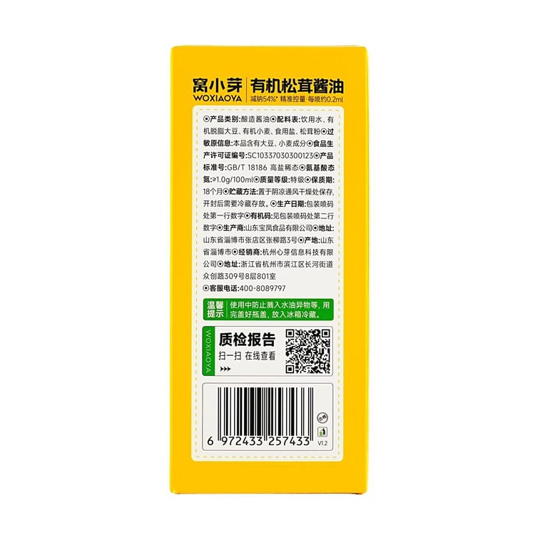 Woxiaoya Organic Matsutake Brewed Soy Sauce, Non-GMO Soybean Raw Material, Uniform Atomized Spraying, 100ml