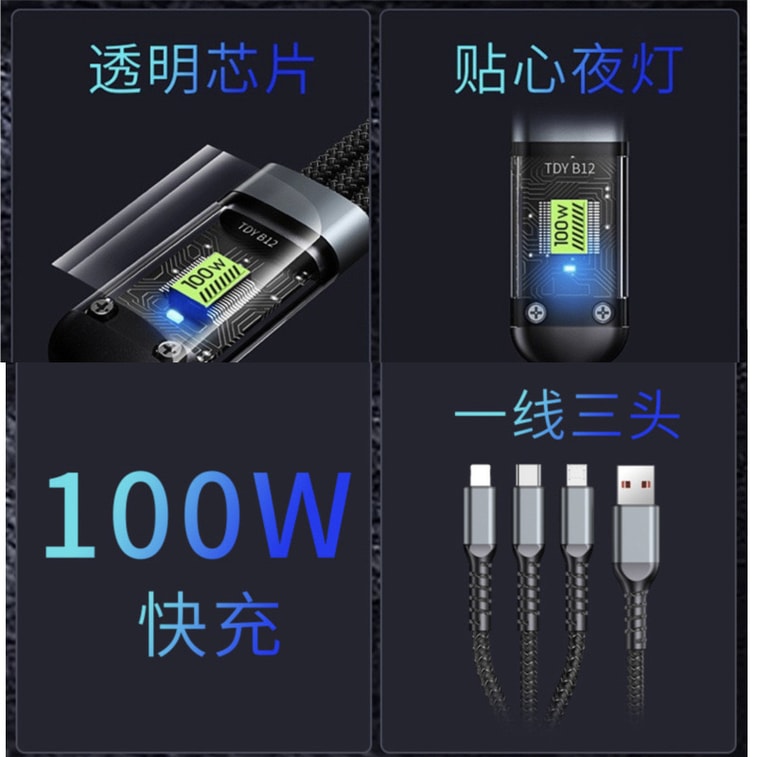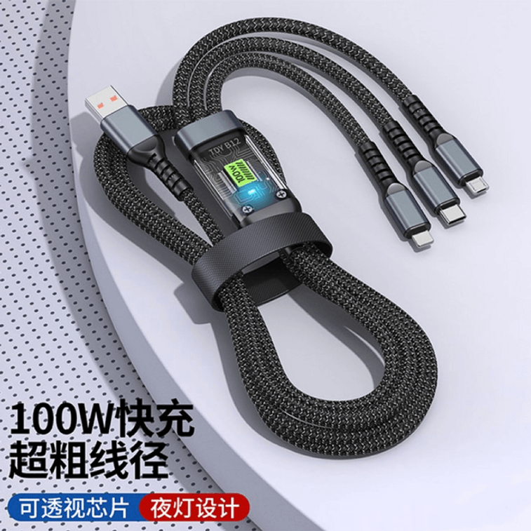 100W Retractable 3 In 1 Fast Charging Car Cable For Apple Iphone Huawei Android Black 1.2m
