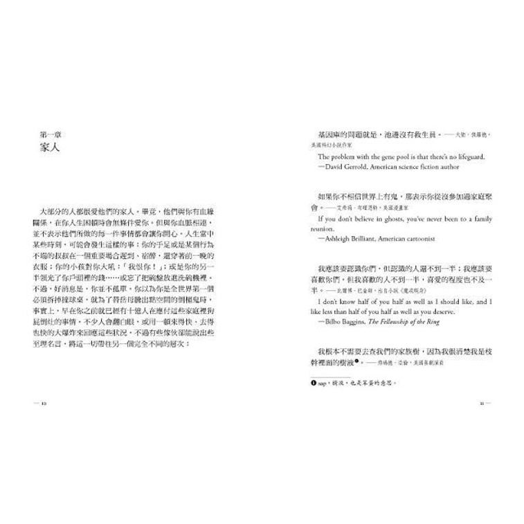 大部分的人都很愛他們的家人。畢竟,他們與你有血緣關係,在你人生困頓時會無條件愛你。但與你血脈相連,並不表示他們所做的每一件事情,都會讓你開心。人生當中某些時刻,可能會發生這樣的事:你的手足或是某個行為不端的叔叔在一個重要場合遲到、宿醉,還穿著前一晚的衣服;你的小孩對你大吼:「我恨你!」;或是你的另一半領光了你戶頭裡的錢……或忘了把碗盤放進洗碗機裡。不過,好消息是,你並不孤單。你以為你是全世界第一個必須拆掉撞球桌,就為了替岳母騰出點空間的倒楣鬼時,事實上,早在你之前就已經有十億人在應付這些家庭裡狗屁倒灶的事情。不少人會翻白眼,或用一頓來得快、去得也快的大爆炸來回應這些狀況,不過有些傢伙卻能說出一些至理名言,將這一切帶往另一個完全不同的層次: