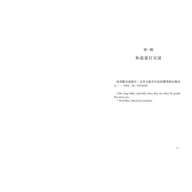 有時候,過一段沒有親密愛人陪伴的日子,會比與他們共享時光更美好。這聽起來不太合理,但獨處的確有許多好處。很不幸,你們這些人都有老婆、老公、寵物、女友、稅金與小孩……他們不會等你中場休息。所以當你想放鬆的夜晚被一串愚蠢的嘮叨打斷時,你有兩個選擇:暫停比賽,拾起你的耐心處理眼前的狀況,或是追隨以下這些王八蛋的腳步,大聲說出這些至理名言:我不知道,也不在乎,那根本沒差!——阿爾伯特.愛因斯坦,物理哲學家