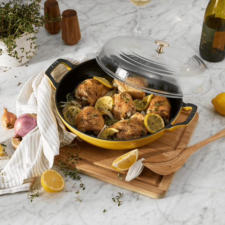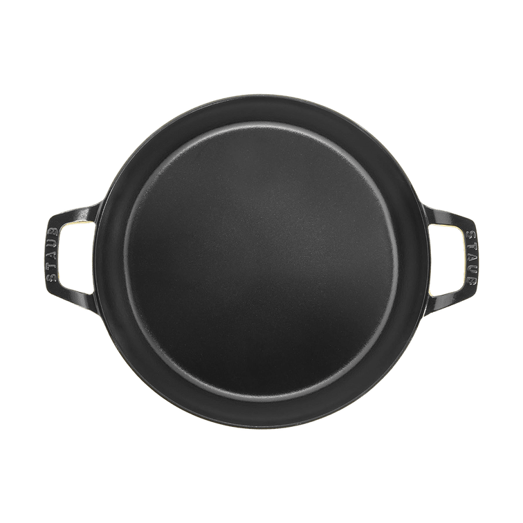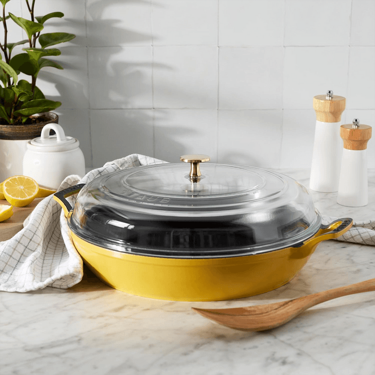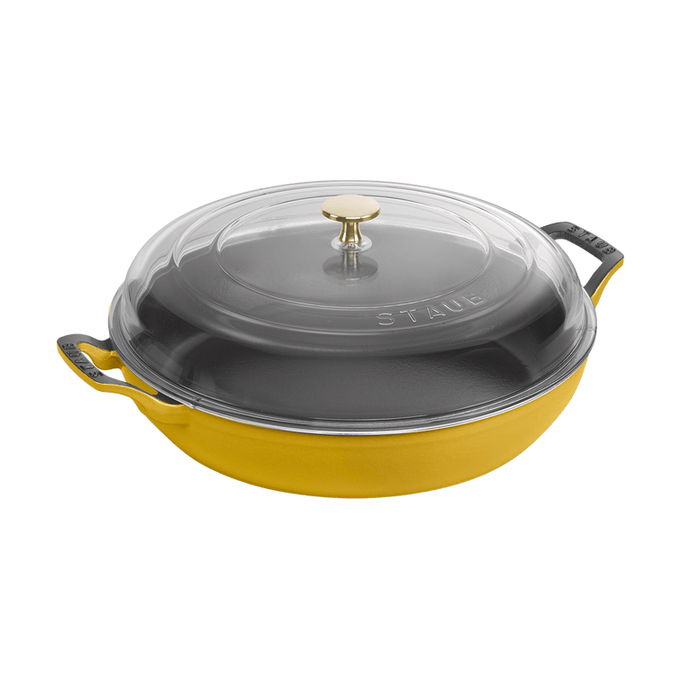 The STAUB 3.5-quart braiser with glass lid is the perfect cookware for one-pot dinners, slow-cooked braises, and simmered soups. The heavyweight, domed glass lid locks in moisture and accommodates large cuts of meat. STAUB cast iron possesses exceptional heat-retention qualities, so the pot heats evenly throughout. The textured black matte enamel interior ensures exceptional browning and requires no seasoning.