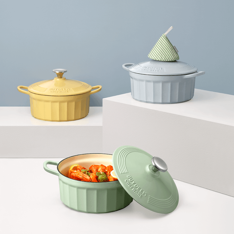 Throwing food in a pot and producing wholesome, flavorful, moist meals is simplified with Buydeem Enameled Cast Iron Dutch Oven. Developed for all skill levels, unique features like raised dots on the lid, non-stick enamel, and a cupcake shape that distributes heat throughout the pot make the cooking experience pleasurable. Finished with a retro green color, this delightful Dutch Oven will shine as the centerpiece to any table setting.
