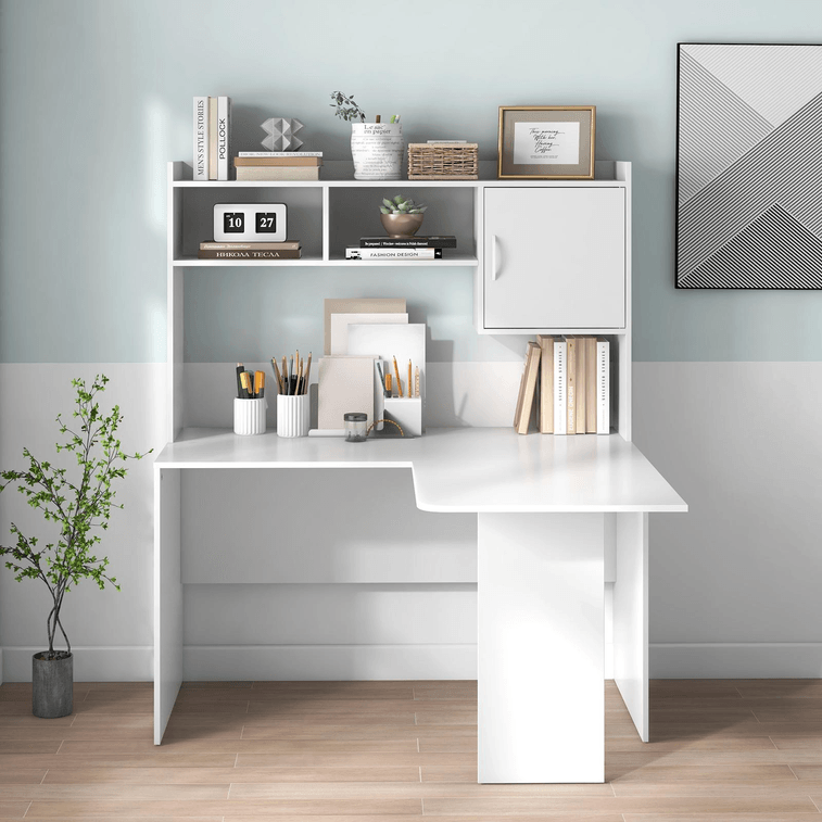 49 Inch L-Shaped Desk Corner Computer Desk With Open Storage Hutch And CabInet-White | Yami