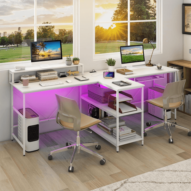 94.5 Inch 2-Person Reversible Computer Desk Long Office Desk With LED Lights-White | Yami