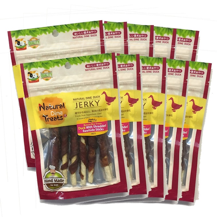 Savory, delicious Duck wrapped rawhide stick treats. . Promotes good dental hygiene. ALL NATURAL PREMIUM SAVORY, DELICIOUS DUCK WRAPPED RAWHIDE STICK TREAT. PROMOTES GOOD DENTAL HYGIENE. DOUBLE SEALED PACKAGING FOR MAXIMUM PRODUCT SAFETY. A PREMIUM HEALTHY DOG SNACK TREAT. INGREDIENTS: ALL NATURAL DUCK & RAWHIDE. NOT FOR HUMAN CONSUMPTION; GOOD TO KEEP YOUR PETS BUSY AND HAPPY AT THE SAME TIME.REFRIGERATE AFTER OPENING AND BEST WHEN CONSUMED WITHIN 10 DAYS.KEEP AWAY FROM DIRECT SUNLIGHT, HEAT, & HUMIDITY. ***MADE IN THAILAND***