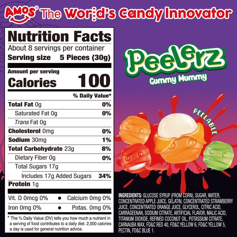 AMOS Peelerz Gummies Candy 4D Mummy Shaped Halloween Candy Treats for Kids 8.47oz 【Orange+Strawberry+Apple 3Flavor】