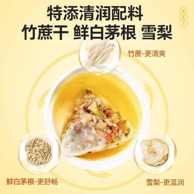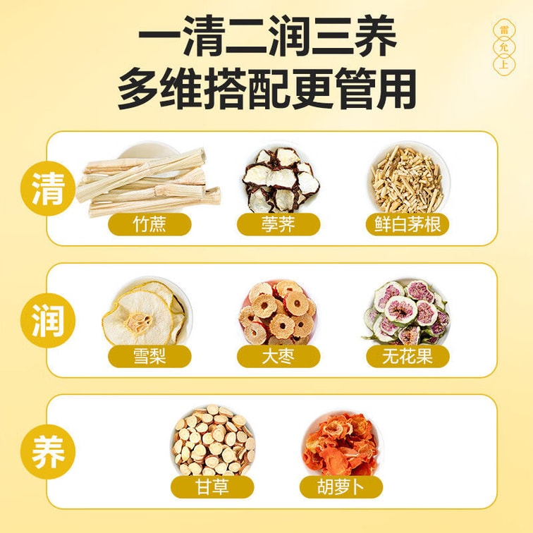 It is a classic refreshing tea drink originated from the folk of Lingnan, which is highly favored for its refreshing, sweet and mild properties that can relieve dryness. This tea drink is made from carefully selected natural ingredients such as sugarcane, reed root and snow pear. It contains no caffeine or added sugar, yet it offers a naturally sweet taste. Its core efficacy lies in clearing heat and reducing internal heat, as well as promoting the production of body fluids and quenching thirst. It can effectively alleviate dry mouth and throat discomfort caused by hot weather or internal heat. It has the functions of moistening the lungs and resolving phlegm, as well as nourishing Yin and moistening dryness. It is like a "gentle timely rain" for the body. It is especially suitable for people to drink during the dry summer and early autumn seasons or those who stay in air-conditioned environments for a long time, providing a mild nourishment and care for the whole family, young and old.