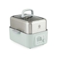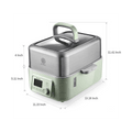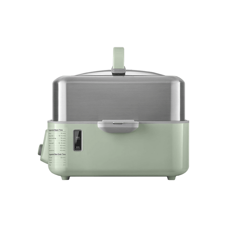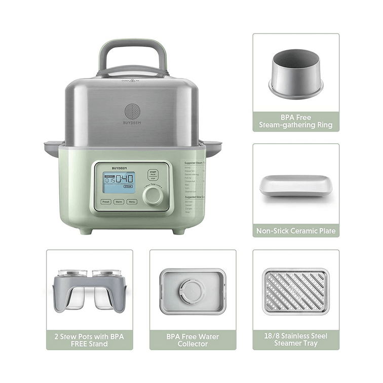 This steamer comes complete with essentials to make it ready to use right out of the box: stainless steel steaming tray, ceramic steaming plate, a 2L water reservoir, stewing pots and stainless-steel lid and a drip tray that makes cleanup a breeze.