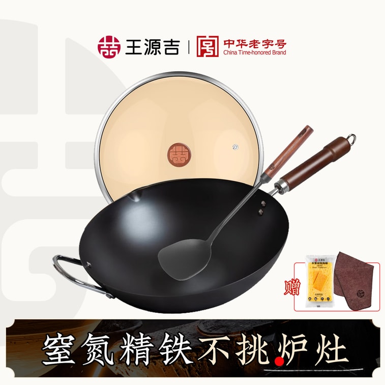 Chinese Carbon Steel Wok + Spatula Set Carbon Steel Pan with Lid Flat Bottom No Chemical Coated for All Stoves 36cm