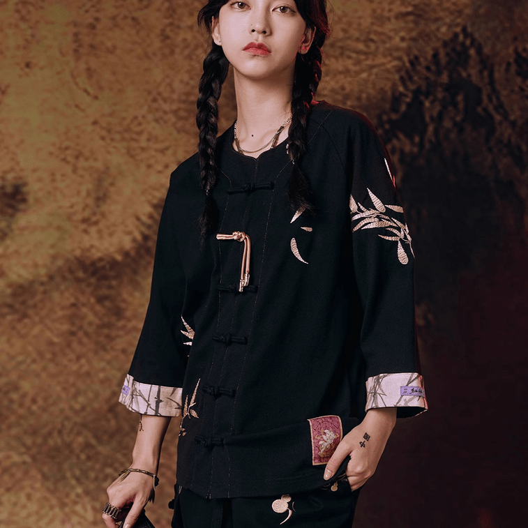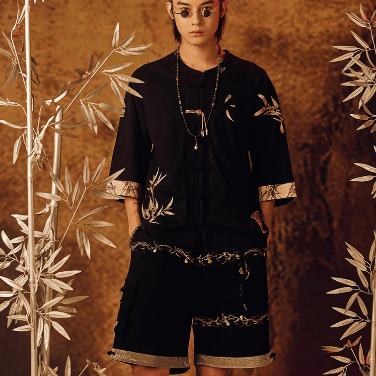 Chinese Style Bamboo Embroidery Loose Retro Button Short Sleeve Shirt For Men WomenSmall