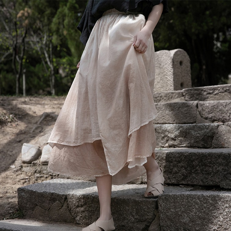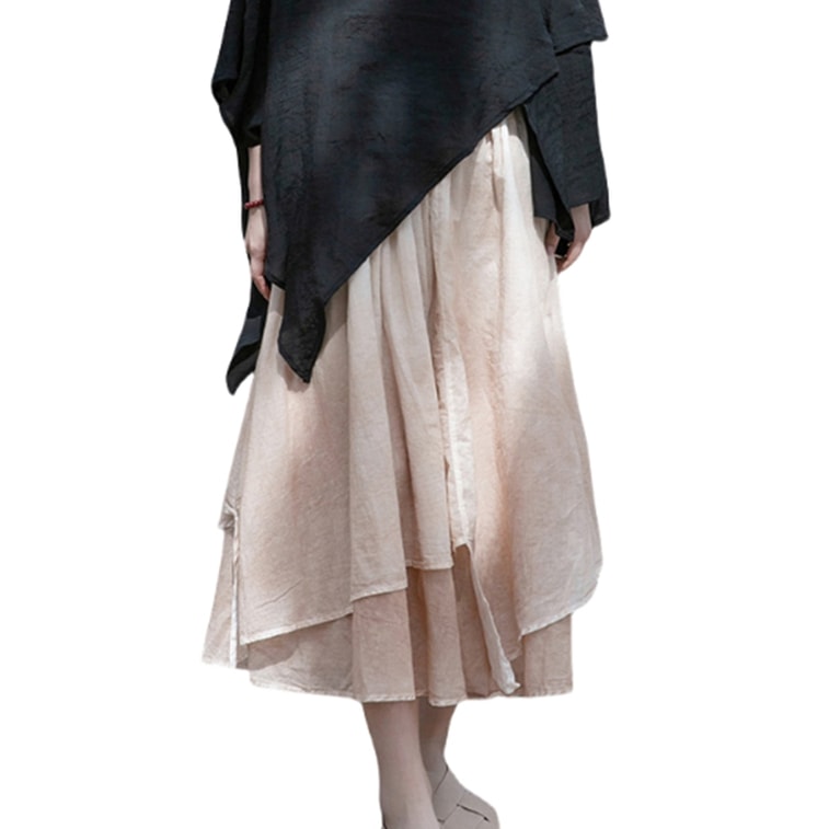 Chinese Style Cotton Flax Double Layer Spray Dyeing Irregular Skirts Khaki Onesize