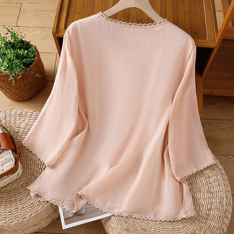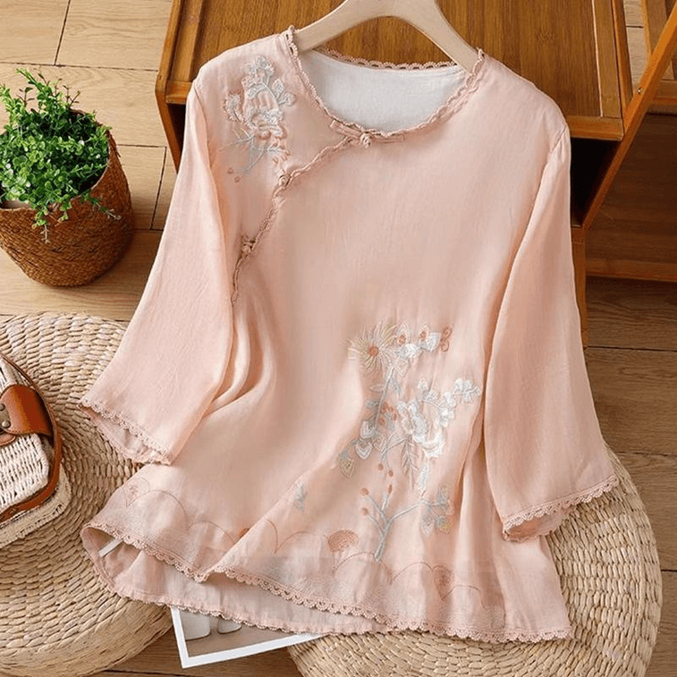 Chinese Style Cotton Linen Knot Button Embroidery Three-quarter Sleeve T Shirt Pink 4XL