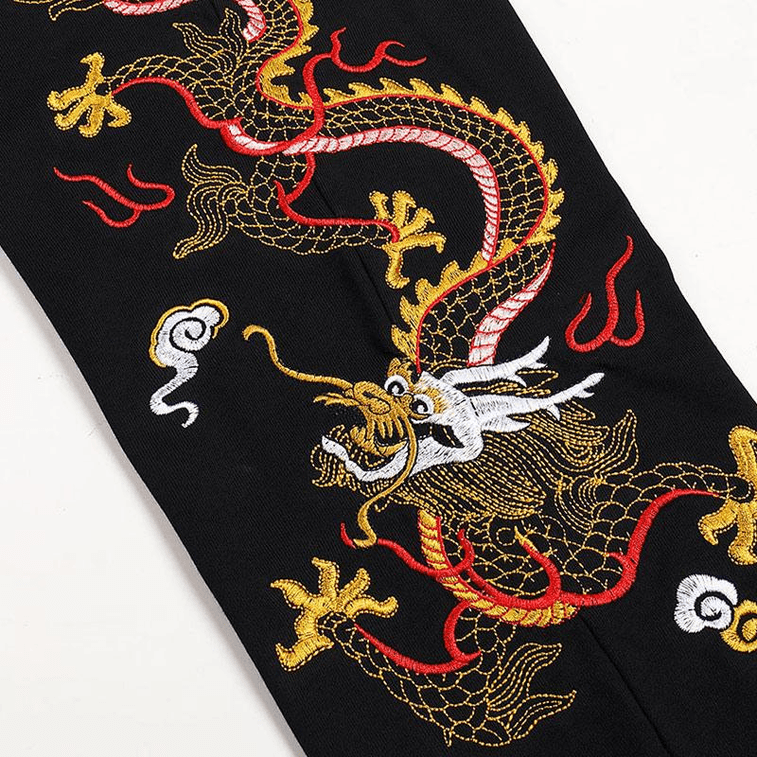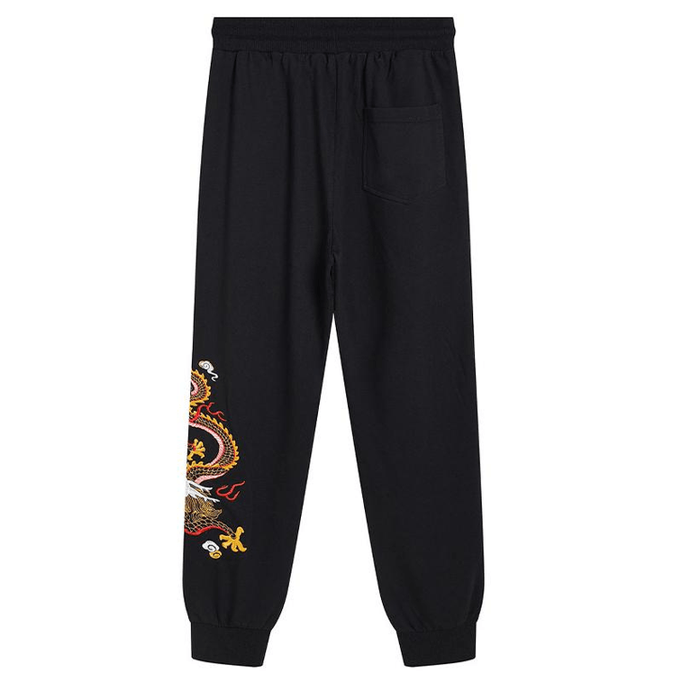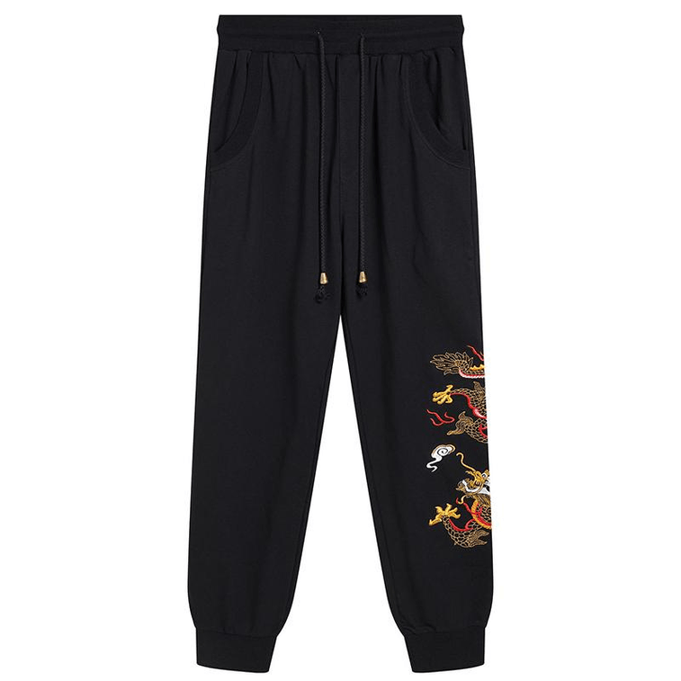 Chinese Style Dragon Embroidered Casual Cuffed Sports Sweatpants Pants Medium