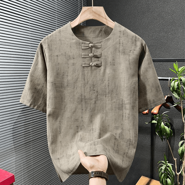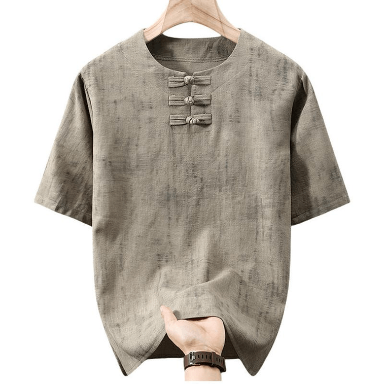 Chinese Style Flax Print Retro Button Short Sleeve T Shirt Coffee 10XL
