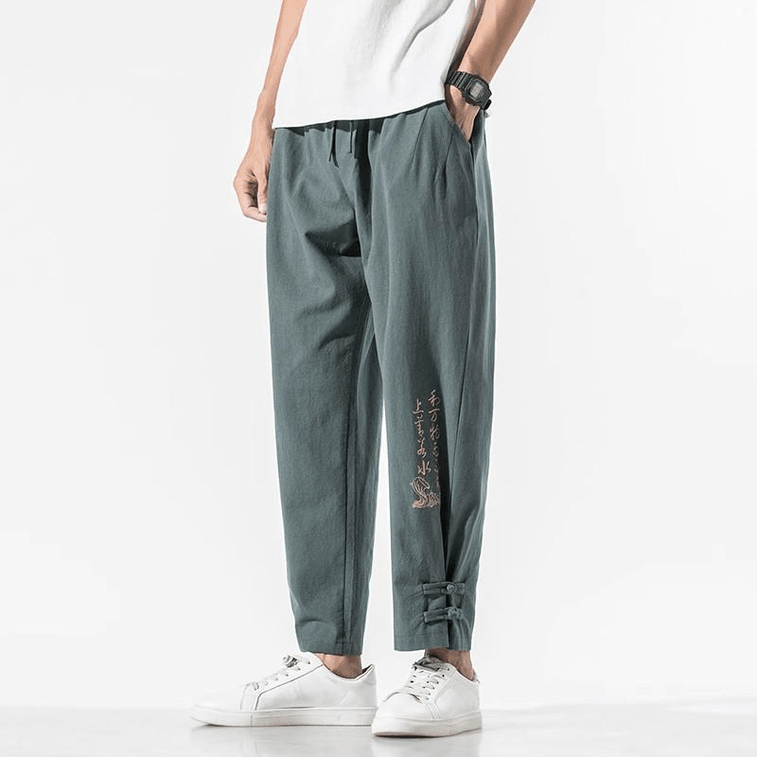 Chinese Style Linen-Cotton Embroidery Loose Cropped Pants for Men Green M