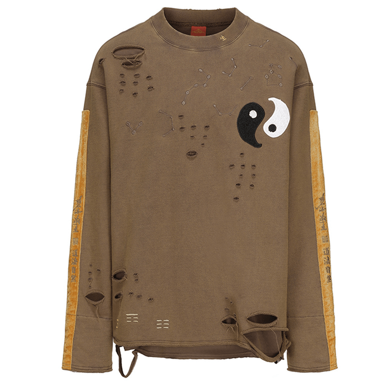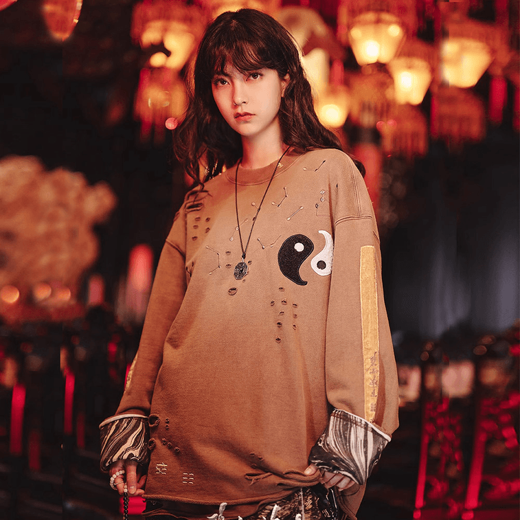 Chinese Style Loose Tai Chi Embroidery Ripped Long Sleeve Hoodie For Men Women,Medium