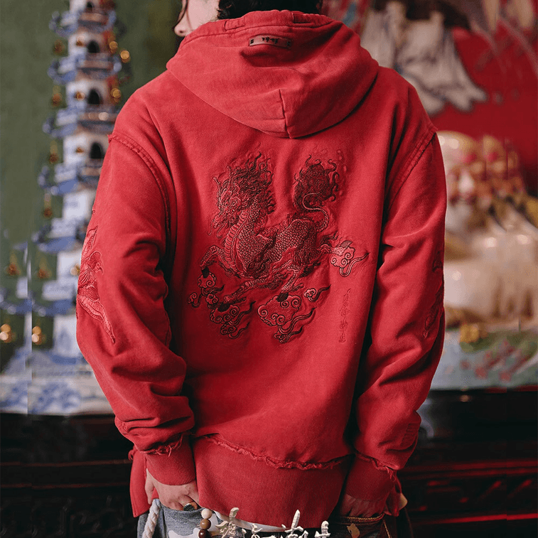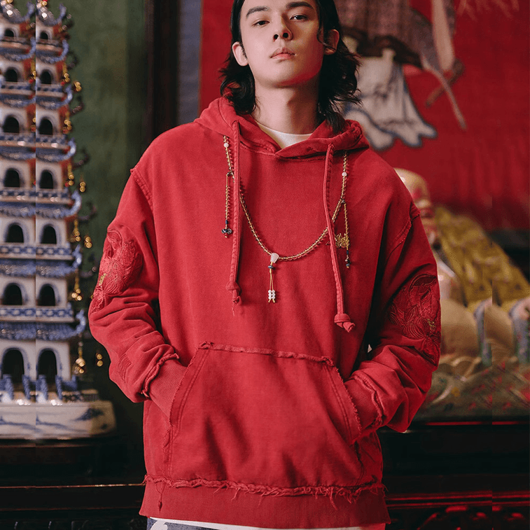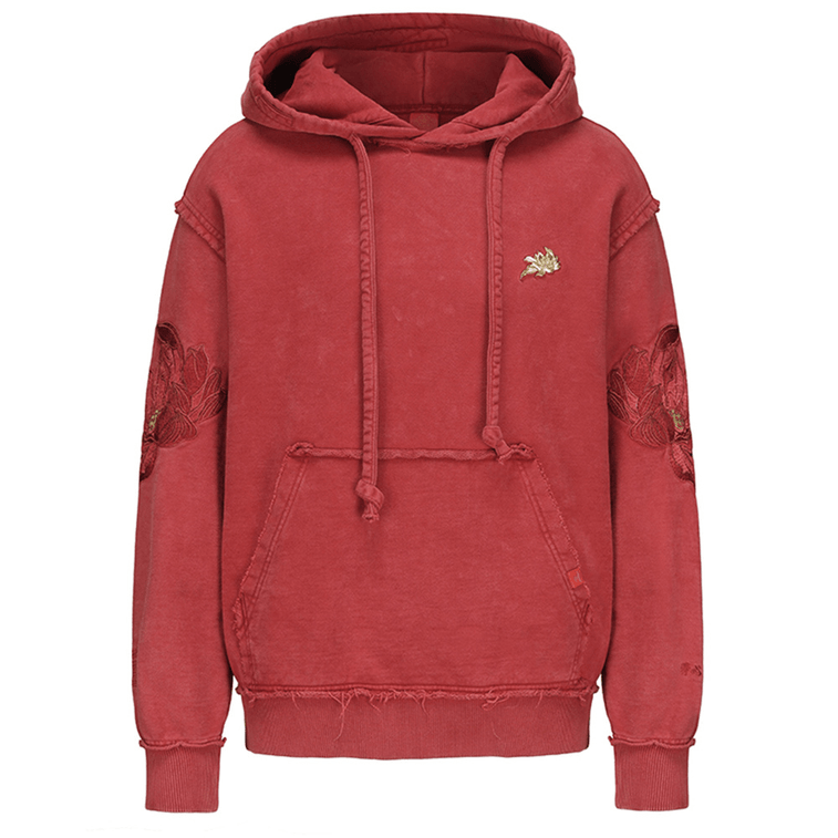 Chinese Style Lotus Embroidery Hooded Hoodie For Men Women-RedLarge