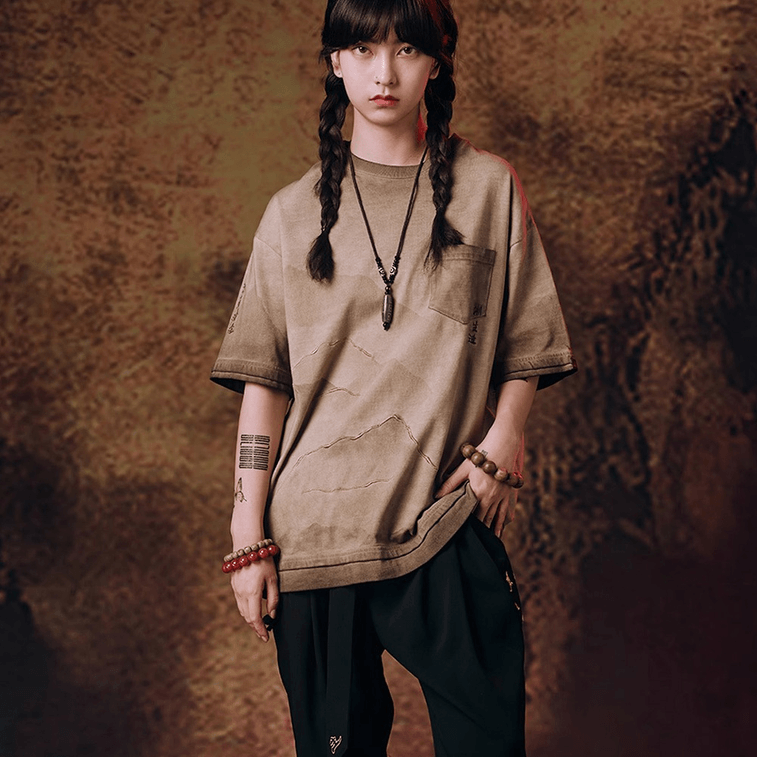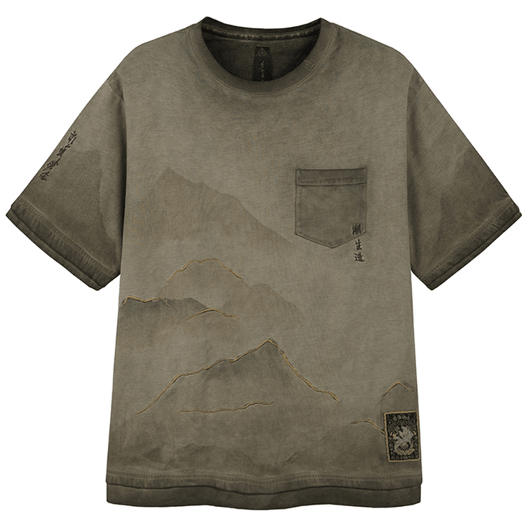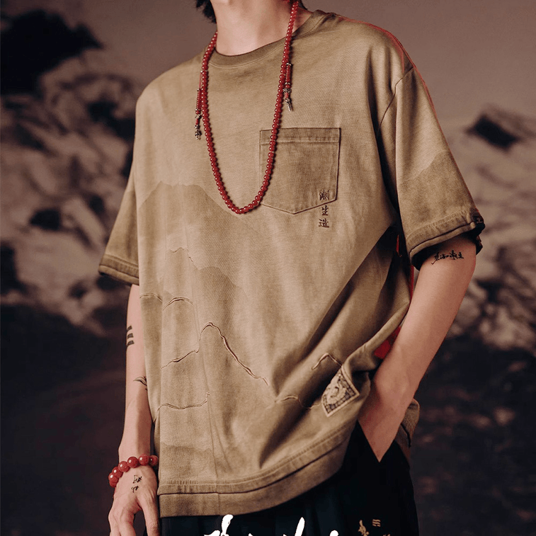 Chinese Style Printed Front Pocket Short Sleeve T-shirt For Men Women,Medium