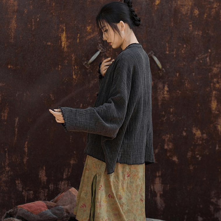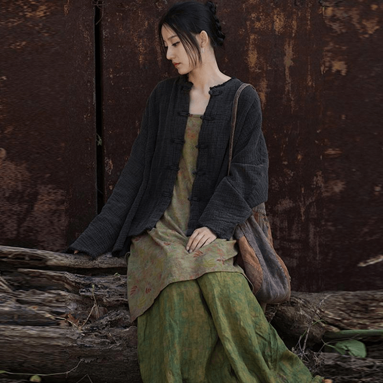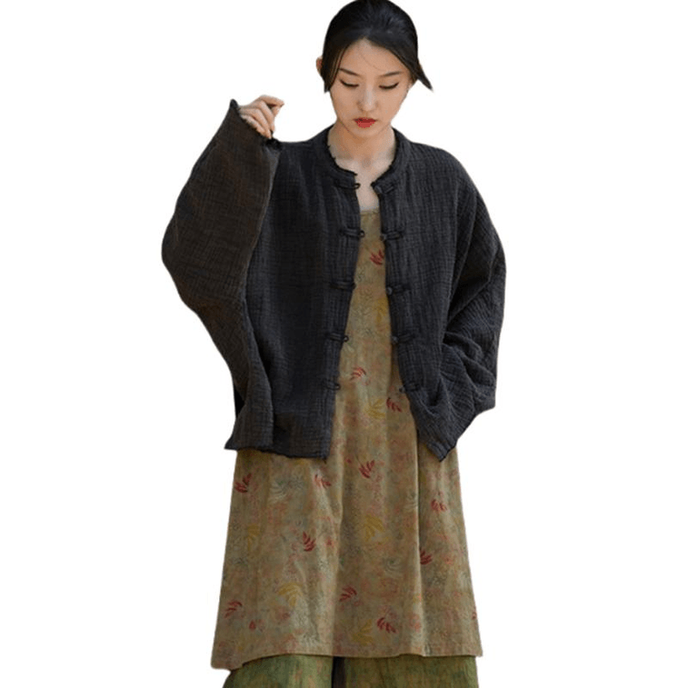 Chinese Style Ramie Fold Retro Button Cardigan Small Coat Black Onesize
