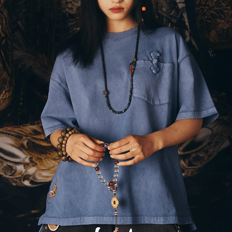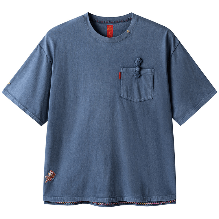 Chinese Style Retro Button Front Pocket Cotton Short Sleeve T-shirt For Men Women Blue,Medium