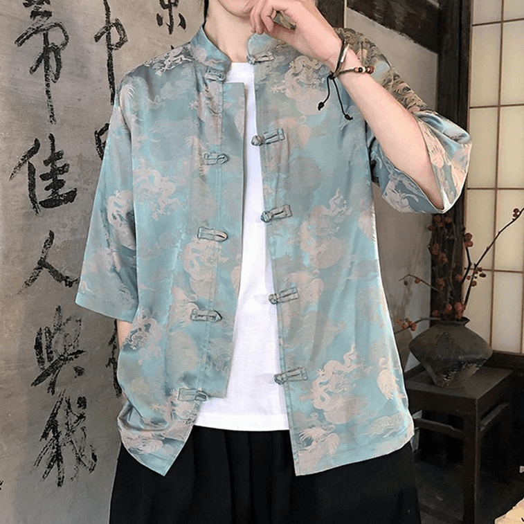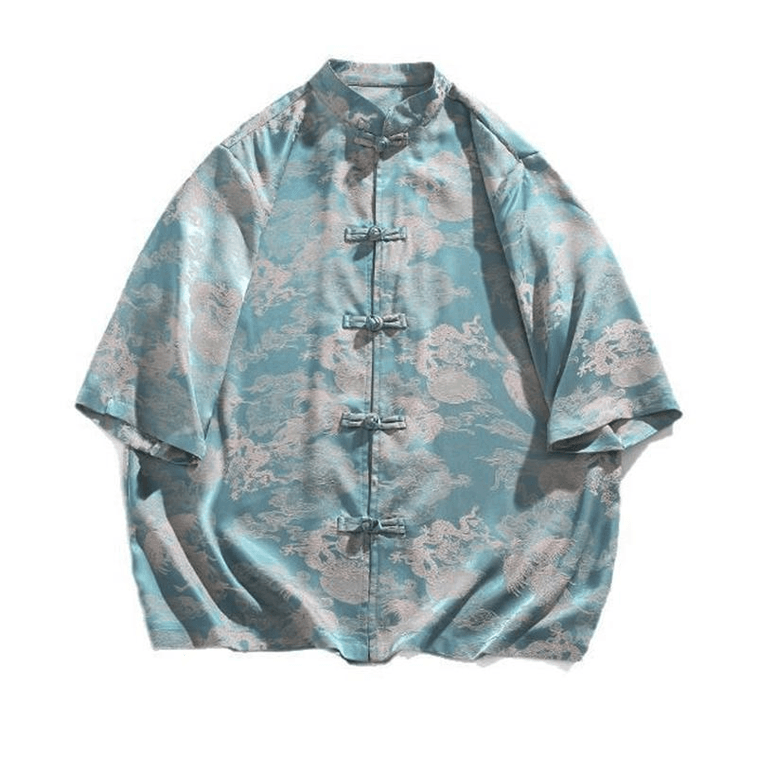 Chinese Style Silk Jacquard Knot Button Stand Collar Half Sleeve Tang Suit Hanfu Blue 5XL | Yami