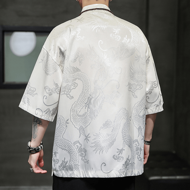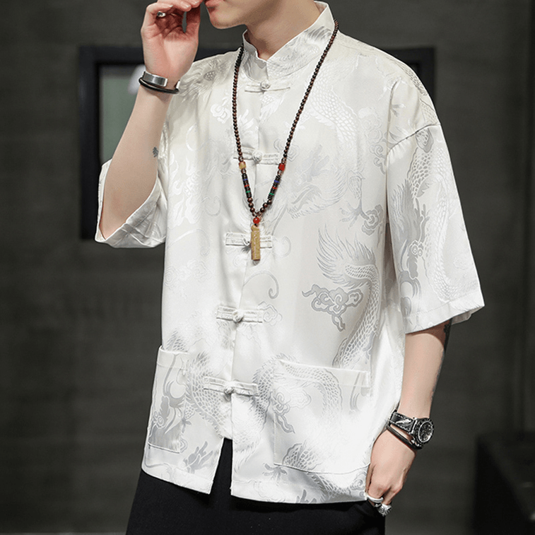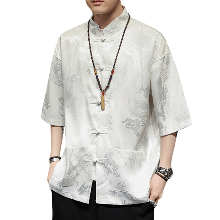 Chinese Style Silk Shirt Jacquard Retro Button Short Sleeve Tang-costume Shirt White 2X-Large | Yami