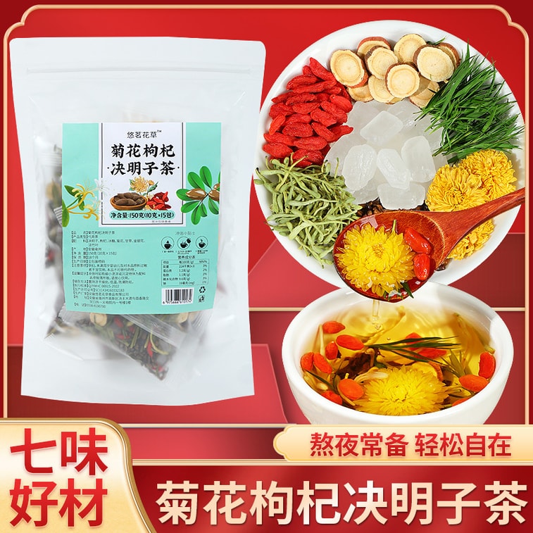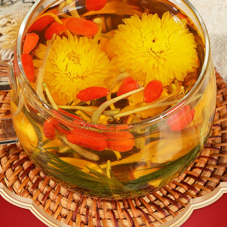 Rock sugar, goji berries, cassia seeds, ganoderma lucidum, licorice, chrysanthemum, honeysuckle.