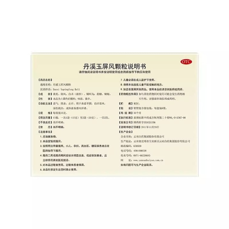 | Standard Packaging | Danxi Yupingfeng granule 6 bags/box |