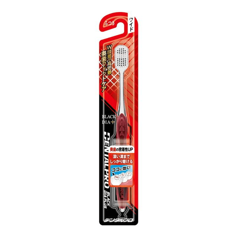 This is a high-grade product incorporating new technology from the Black Series, featuring special black bristles that effectively remove plaque with water alone. It has a wide head that allows thorough brushing even in a short time. Additionally, by giving slight steps to each tuft of bristles, the brush can reach deep grooves of the molars, enhancing plaque removal effectiveness. The bristle arrangement wraps around the molars, enabling more effective brushing.