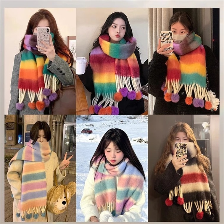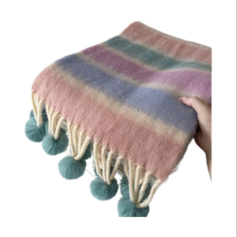 Dopamine-colored Striped Handmade Fur Ball Warm Scarf Thickened Cold-proof Couple's Scarf - Blue Powder 1Pc