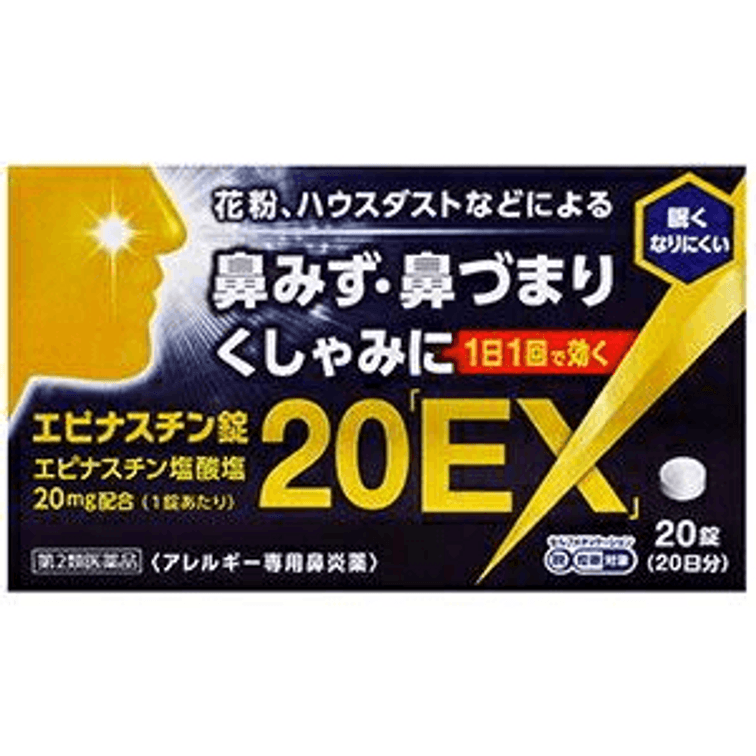 Epinastine Tablets 20 "EX" contain epinastine hydrochloride, a second-generation antihistamine. Taken once daily before bedtime, it is highly effective for symptoms of allergic rhinitis such as runny nose, nasal congestion, and sneezing.