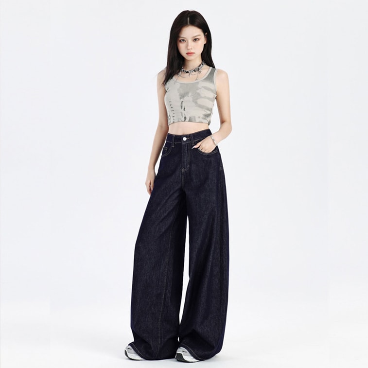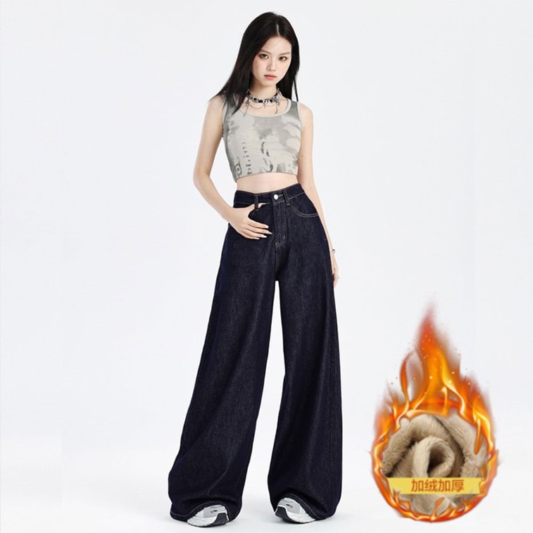 Fade Resistant Dark Blue Jeans Womens New Style American Stylish Loose Slim Fit Straight Leg Floor Length Wide Leg Pants Dark Blue Fleece Lined M