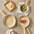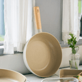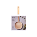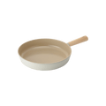Scandinavian inspired design with simple round contours, subtle color combination of matte off-white outer surfaces and glossy sand-colored inner coating, wooden non-slip grip oval handle and lid top. Silicone rim on the tempered glass-lid matched the body exterior color and it closes the cookware precisely and quietly.