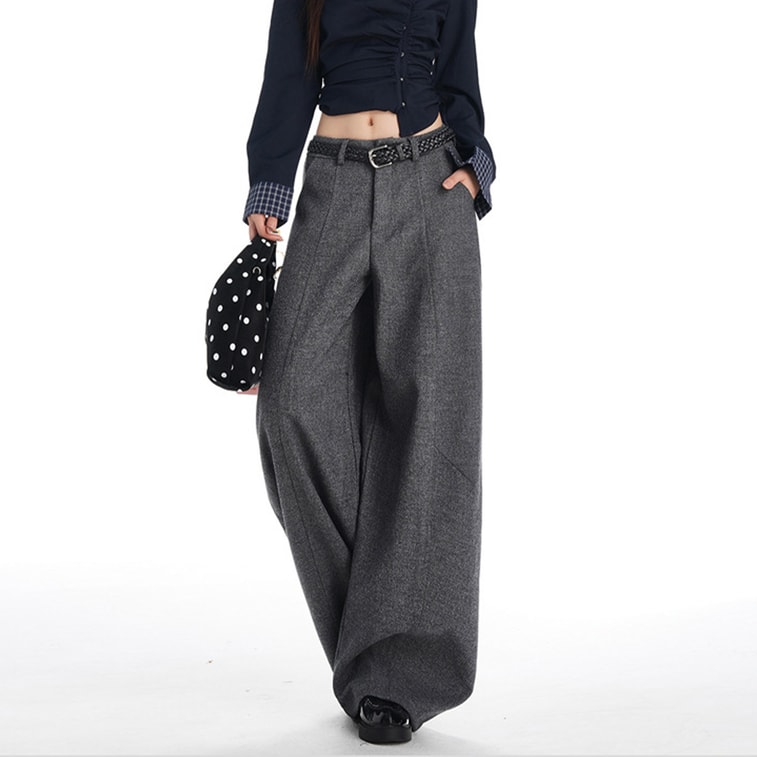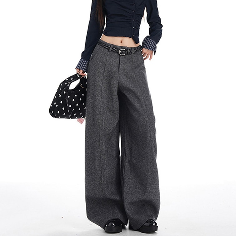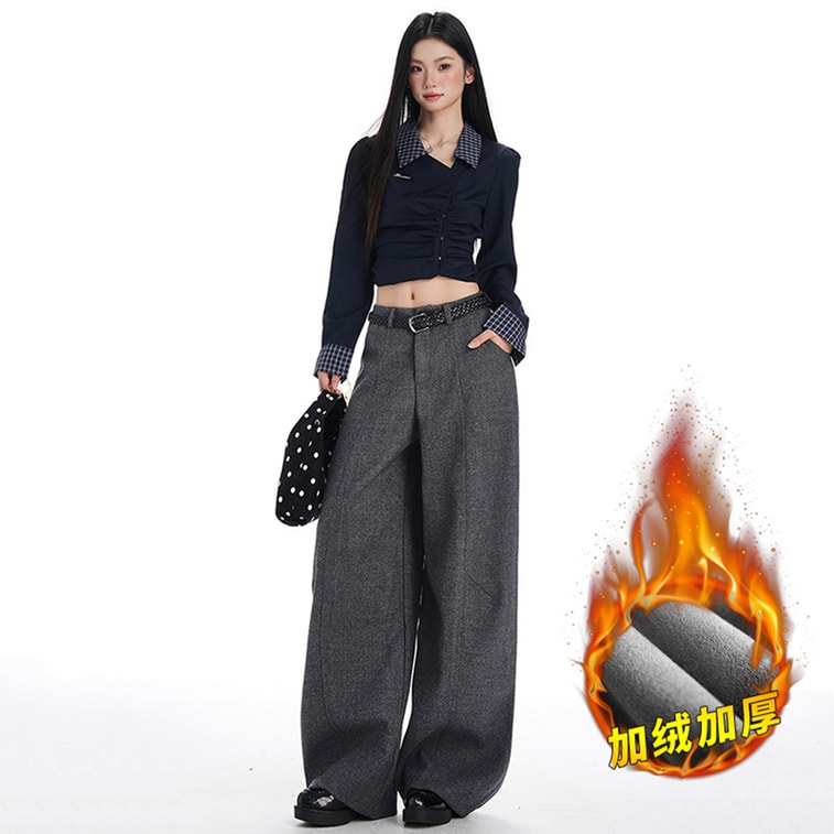 Fleece Lined Wool Blend Casual Pants Womens New Style Thickened Retro High Waisted Loose Wide Leg Floor Length Trousers Dark Gray M