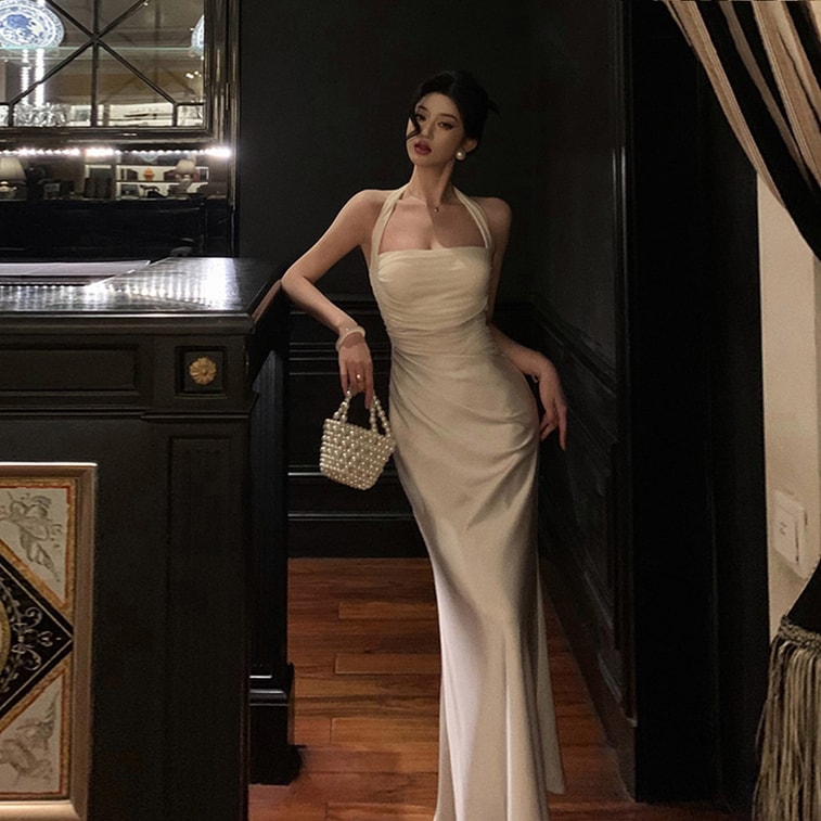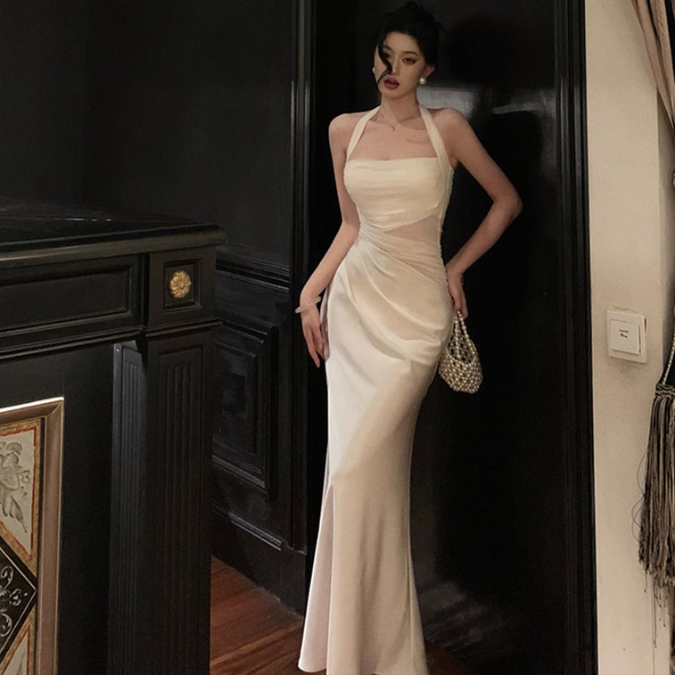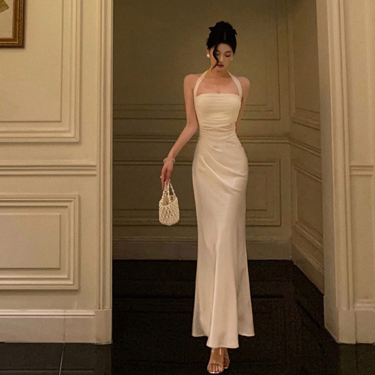 French Niche Slim Bodycon Dress Tulle Satin Patchwork Halter Dress Off White S | Yami