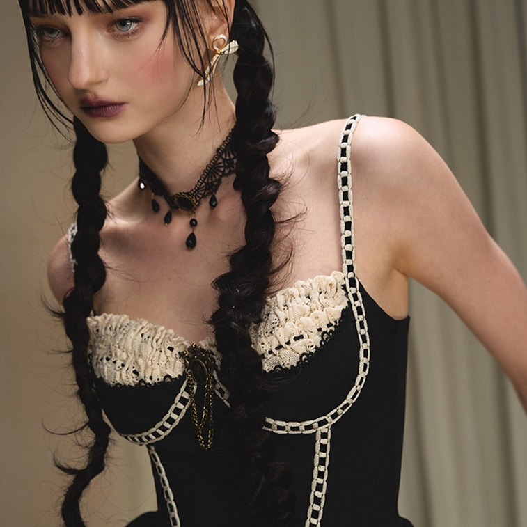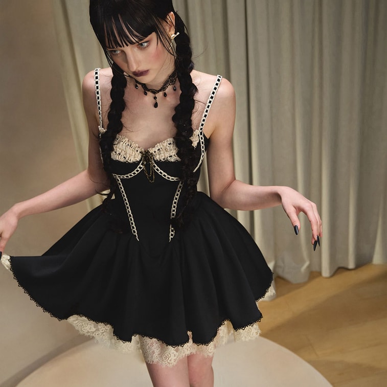 French-Style Little Black Dress, Boned Cami Dress, Birthday Cocktail Dress, Puff Dress Warm Winter Black, Cropped L | Yami