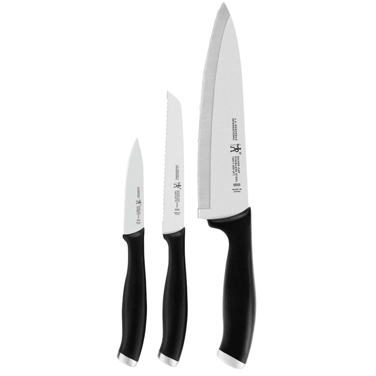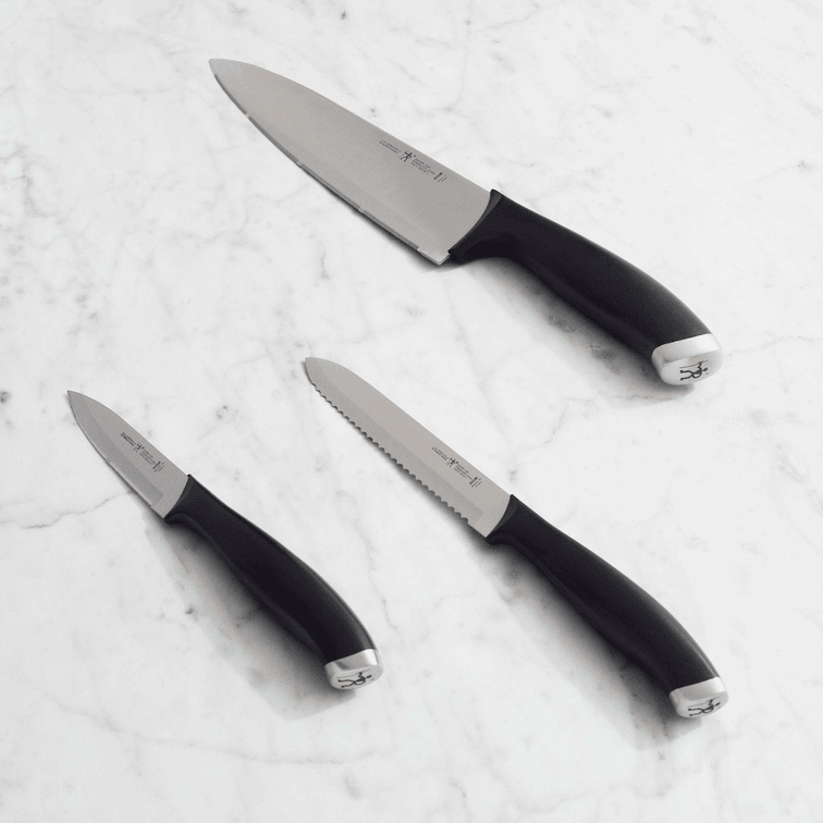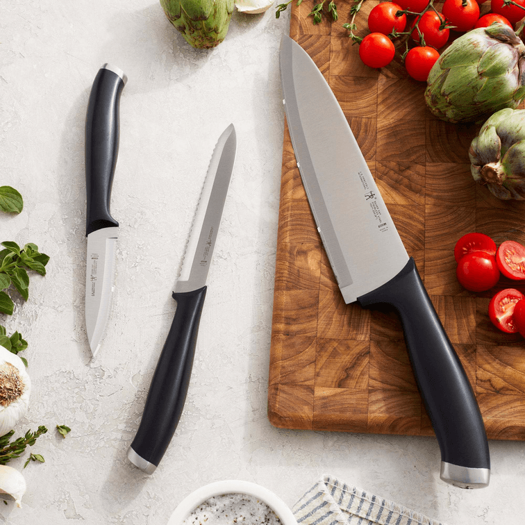The Henckels International Silvercap 3-pc Starter Knife Set sets up new chefs to cut with confidence. Thanks to their handy micro-serrated edge, the blades never need to be sharpened. The all-rounder 8" Chef's Knife is perfect for chopping herbs and dicing onions while the 5" Serrated Utility Knife is ideal for slicing tomatoes. The 3" Paring Knife is excellent for detailed work - like peeling apples or removing blemishes.