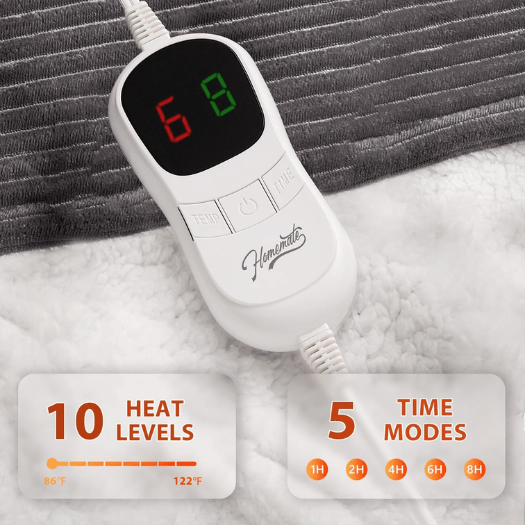 - 【EASY TO USE】: Homemate heated blanket have 10 heat levels,1/2/4/6/8 hours auto shut off.Temperature range is 86-122°F.Very convenient to use,even the elderly,the sick,and the disabled can use it easily.Power Cord is 9.5 feet,this long cord makes the use of the blanket more flexible,can be used on the bed,on the sofa,can be used in the study and office,very convenient.