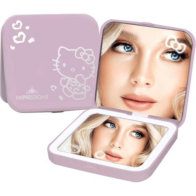 𝐈𝐦𝐩𝐫𝐞𝐬𝐬𝐢𝐨𝐧𝐬 𝐕𝐚𝐧𝐢𝐭𝐲'𝐬 Hello Kitty Supercute compact mirror. A travel makeup mirror with a foldable design and magnification, which adds all the cuteness while you are on vacation or on your way to work. You can even slip it in your purse so that this lighted vanity mirror doesn't slow you down on your travel. This makeup mirror with lights features energy efficient LED lighting that simulates daylight for better color accuracy. So you can turn your hotel bathroom into your personal beauty studio with this light up mirror. This small rectangle mirror includes a personal mirror top with 2x magnification giving you ideal viewing for makeup and other integrated activities. You can also dimmer this multi functional hand mirror with a touch sensor switch to adjust the light’s brightness. So that you can create the correct makeup looks depending on where you’ll be going next. A chic vanity mirror with lights that not only helps in blending your makeup the right way but also blends with your room decor. Meet all your daily demands such as makeup, skincare, draw eyeliner or apply mascara with this led mirror for makeup. You can make your life so much easier with this handheld mirror on a go.