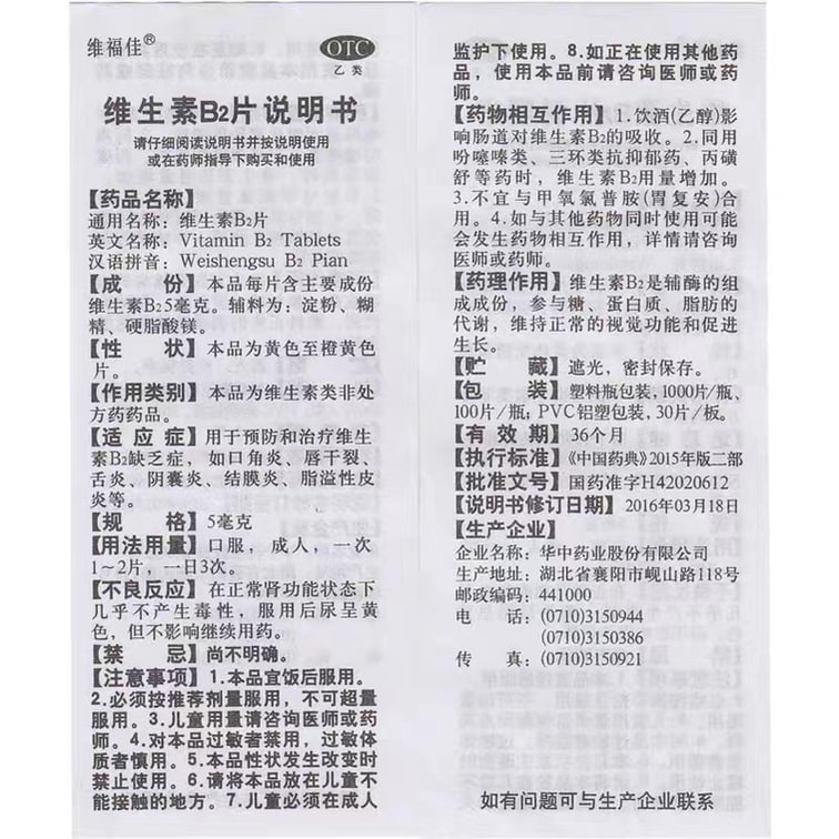 Huazhong Vitamin B2 Tablets are used for angular stomatitis and seborrheic dermatitis 5mg*100 tablets per bottle