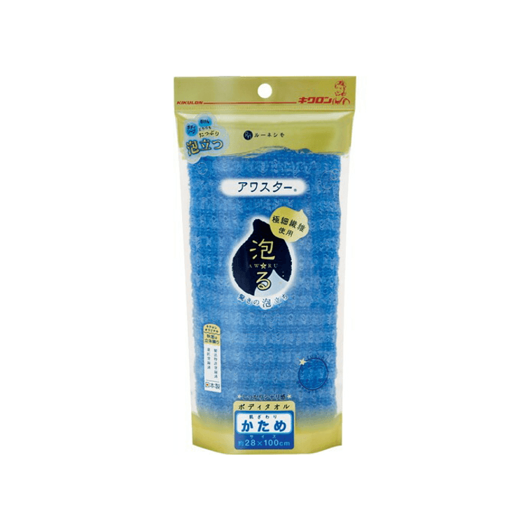 This is a body towel made with ultra-fine fibers. It uses plenty of ultra-fine 66 nylon fibers. It gently cleanses the skin with a soft, crisp texture. Also, thanks to the fine threads and original weaving, it produces more foam than you might expect. It works well with both body soap and soap bars, providing a satisfying washing experience even with a small amount. Firm texture, blue color.