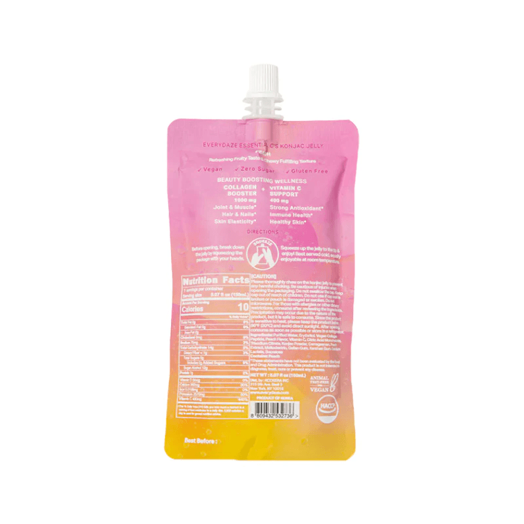 Elevate your snack time to a rejuvenating self-care experience with Essential C's Konjac Jelly. Each full pouch of Essential C's Konjac Jelly contains a mere 10 calories and delivers your essential dose of Collagen and Vitamin C. Collagen works wonders by enhancing skin elasticity and providing support for joints and muscles, while Vitamin C optimizes your immune system and promotes a bright, healthy complexion. The invigorating fruity taste and satisfyingly chewy texture make it a delightful treat for both adults and children. Its convenient travel-friendly packaging ensures that you can enjoy it wherever life takes you, making it a go-to healthy snack for any occasion.
