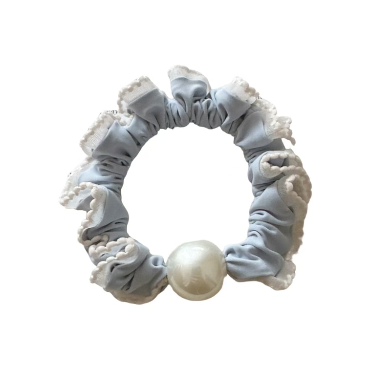 Tangbao Goodies Korean-style cream blue hair tie with pearl lace, little intestine-shaped design, textured fabric scrunchie, elastic hair band for girls, pearl wavy edge style, 2 pieces | Yami