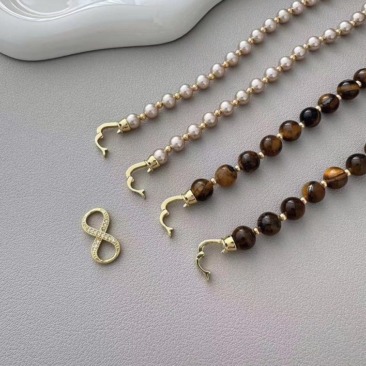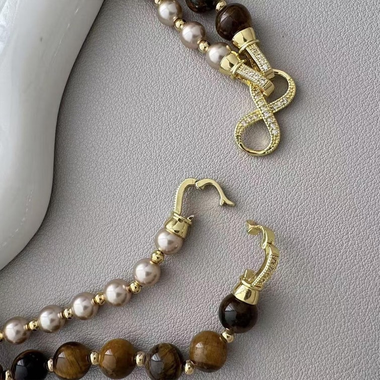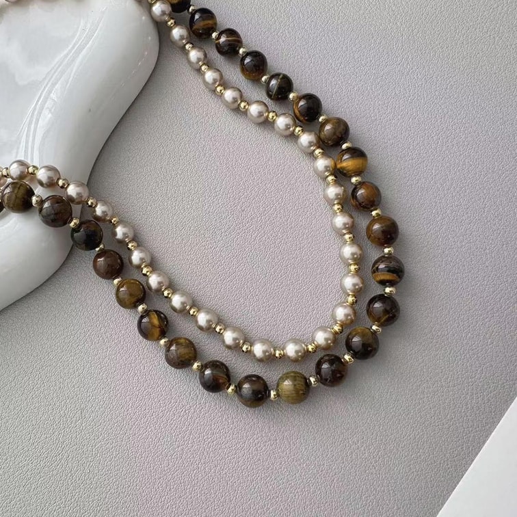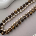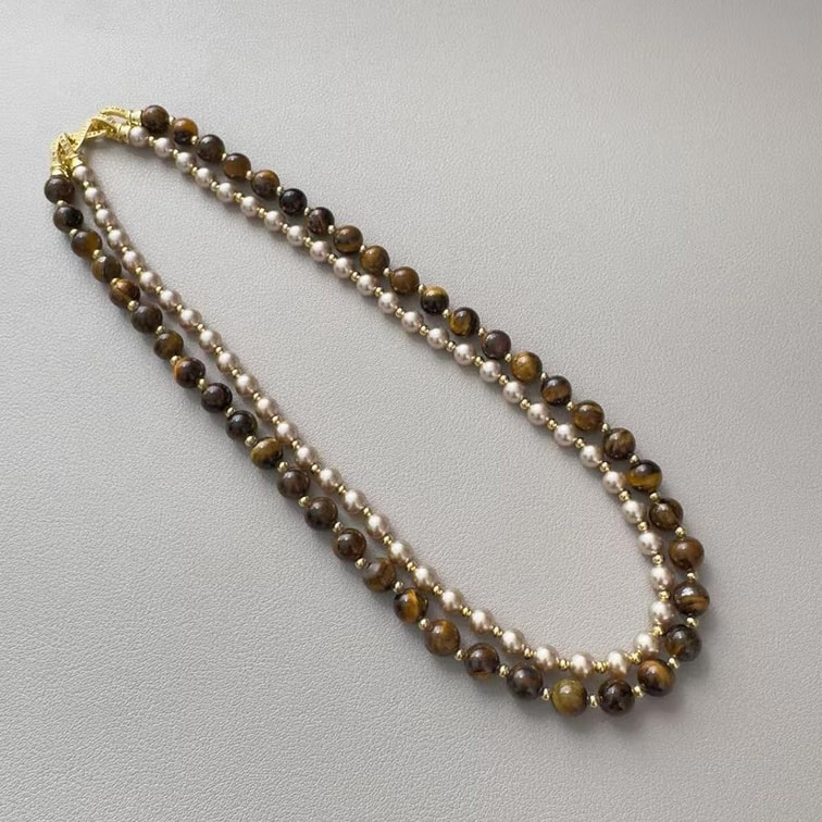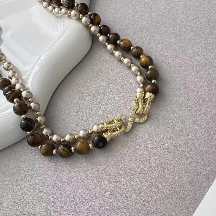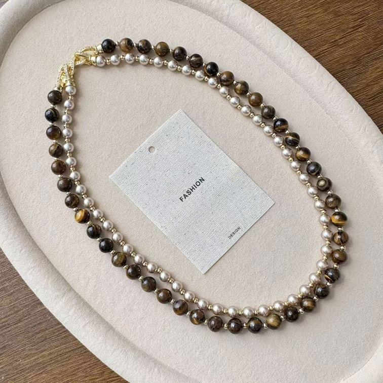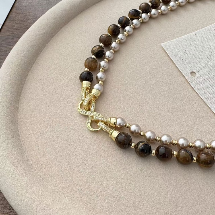 Light Luxury Elegant Layered Clavicle Chain - Figure-8 Clasp Double-Layer Tiger Eye Stone Pearl Necklace F 1 Piece