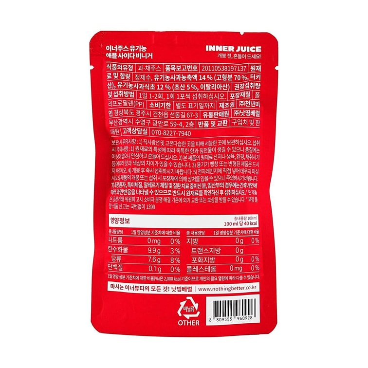 Organic Apple Cider Vinegar Pouch Drink, Inner Juice,3.38 fl oz【100% Natural Fermentation】【Olive Young Selected】