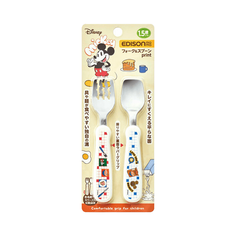 - Features: Exquisite designed 'Mickey' themed tableware! The fork and spoon feature different designs, each with its own unique charm. Indulge in the world of your favorite character. Designed to be your beloved tableware for long-term use. Proper grip support. The unique design makes it easier to master various gripping methods such as 'regular grip' or 'reverse grip'. It helps you transition to the 'pencil grip' method and supports the correct way of holding. With a space for a name. The back has a space for a name, which can be labeled or written directly. *This product does not come with labels. Size/Weight: Fork: 26×13×140mm/23g. Spoon: 27×13×140mm/24g