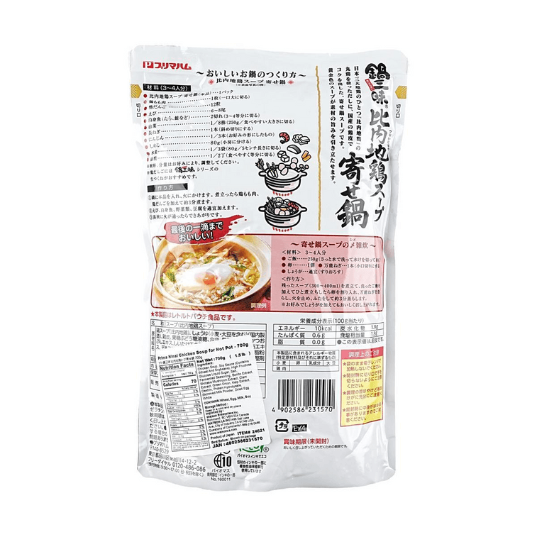 1 pack of Hinai chicken broth, 1 piece of chicken thigh, 12 chicken meatballs, 6-8 shrimp, 2 pieces of fish, 250g of napa cabbage, 1 green onion, a small piece of radish, 80g of mushrooms, 80g of Japanese watercress, and 1 small block of tofu.