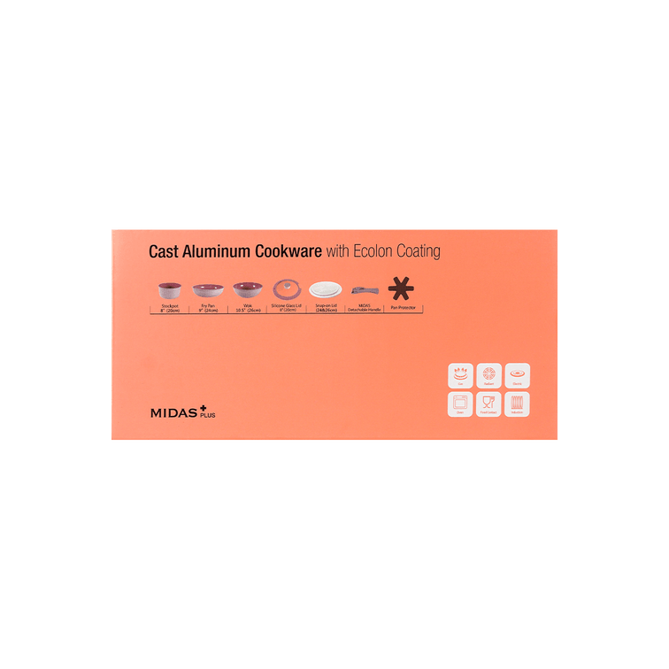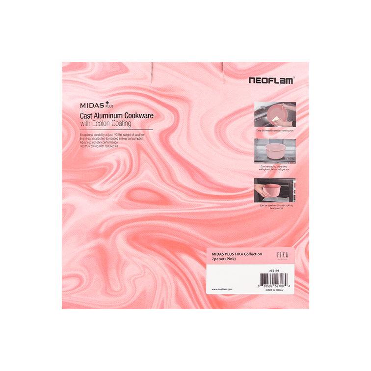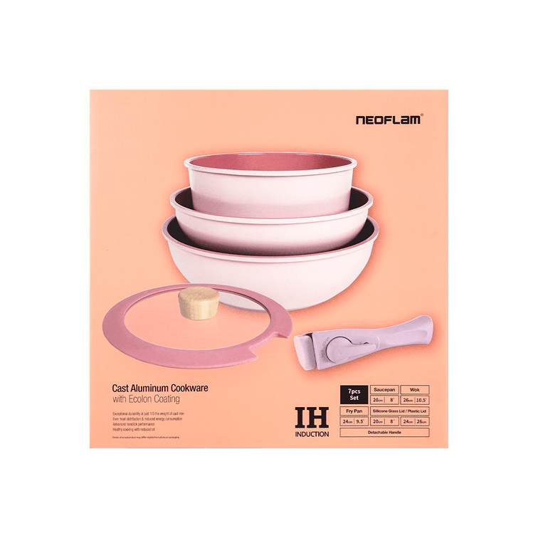MIDAS Plus FIKA Collection Pink 7pc set (Wok, Frypan, Pot W/ Detachable Handle+2Plastic Lids)