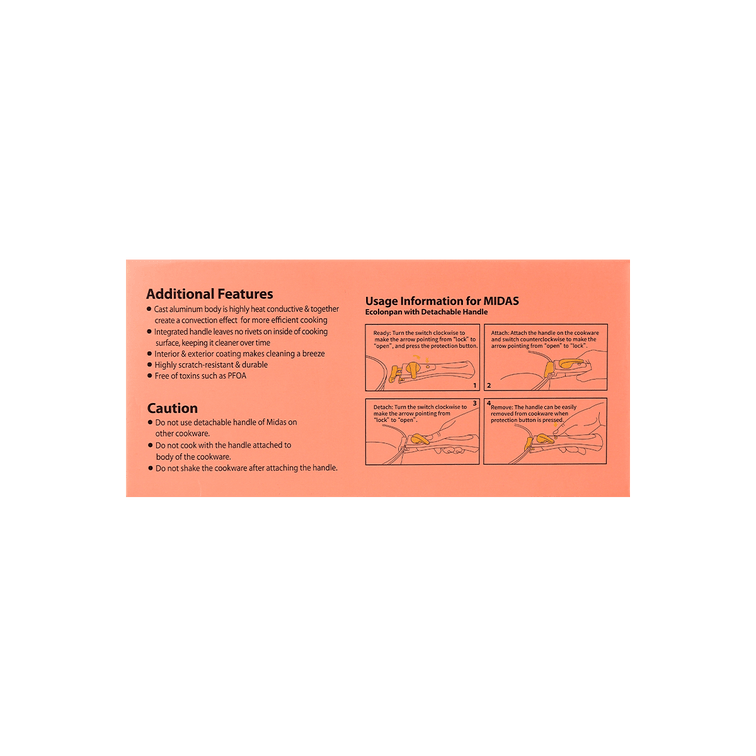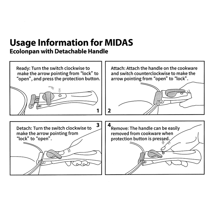 Neoflam Midas with Detachable Handle Midas Cast Aluminum Cookware 9pc Set with detachable handle is a very convenient way to cook your meals. You can cook, bake, and store your meal in a single pot. After you are done cooking, place your cookware in the dishwasher for easy cleaning. Or if you have any food leftovers, simply put a plastic lid on top of the cookware and store it in your refrigerator for later. The MIDAS detachable handle provides excellent grip when latching onto the cookware. It also fully detaches from the cookware safely and easily.